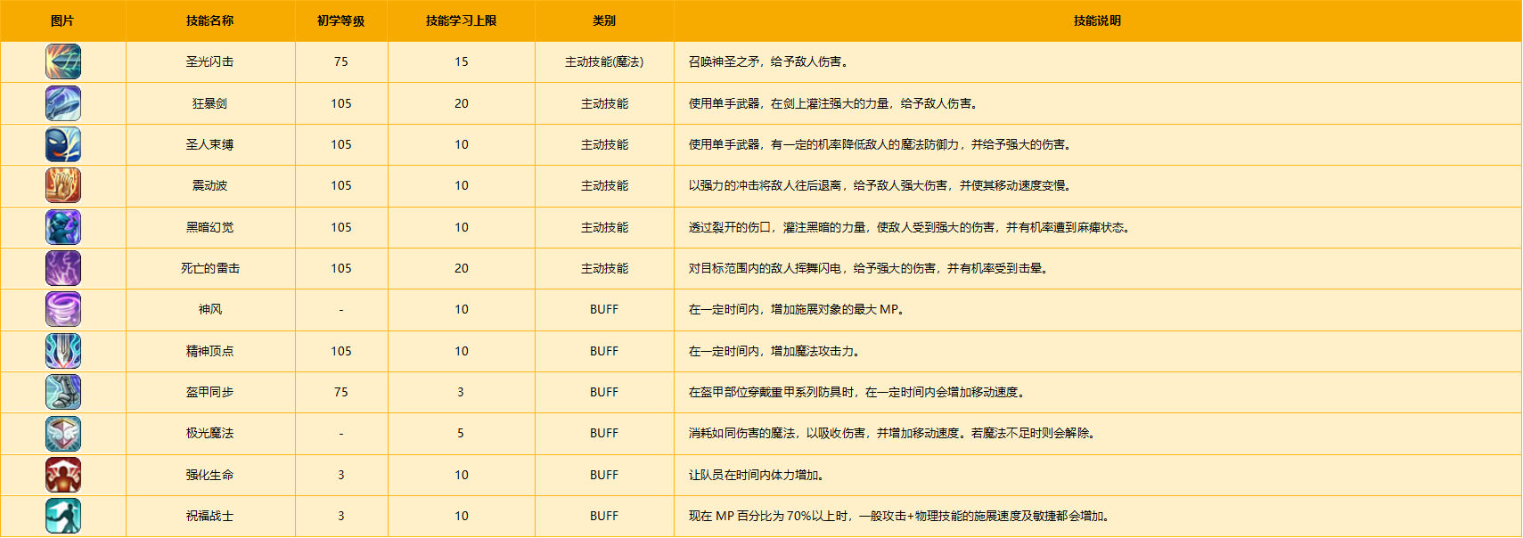职业说明:学习主要是防御性的主动技能与被动技能。